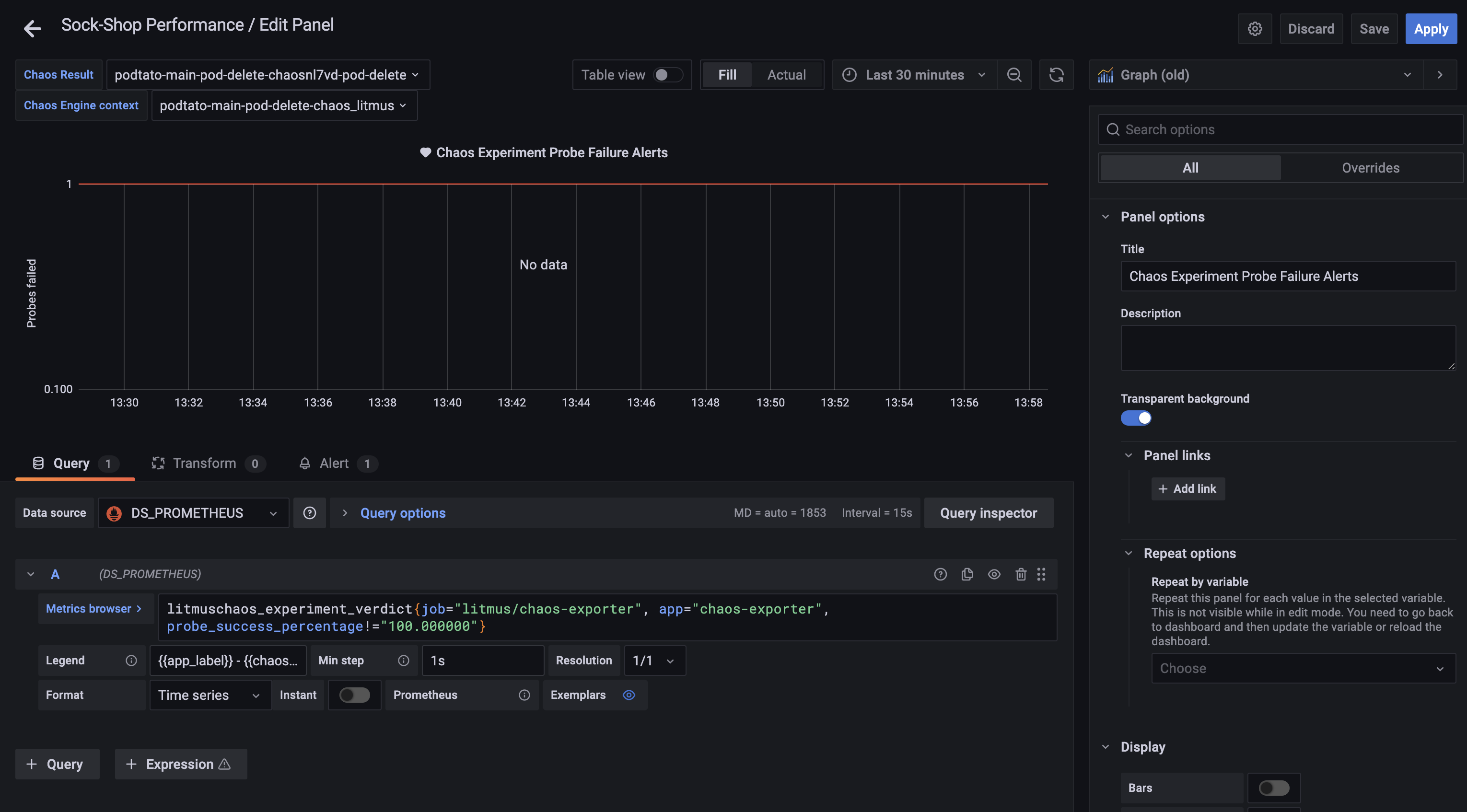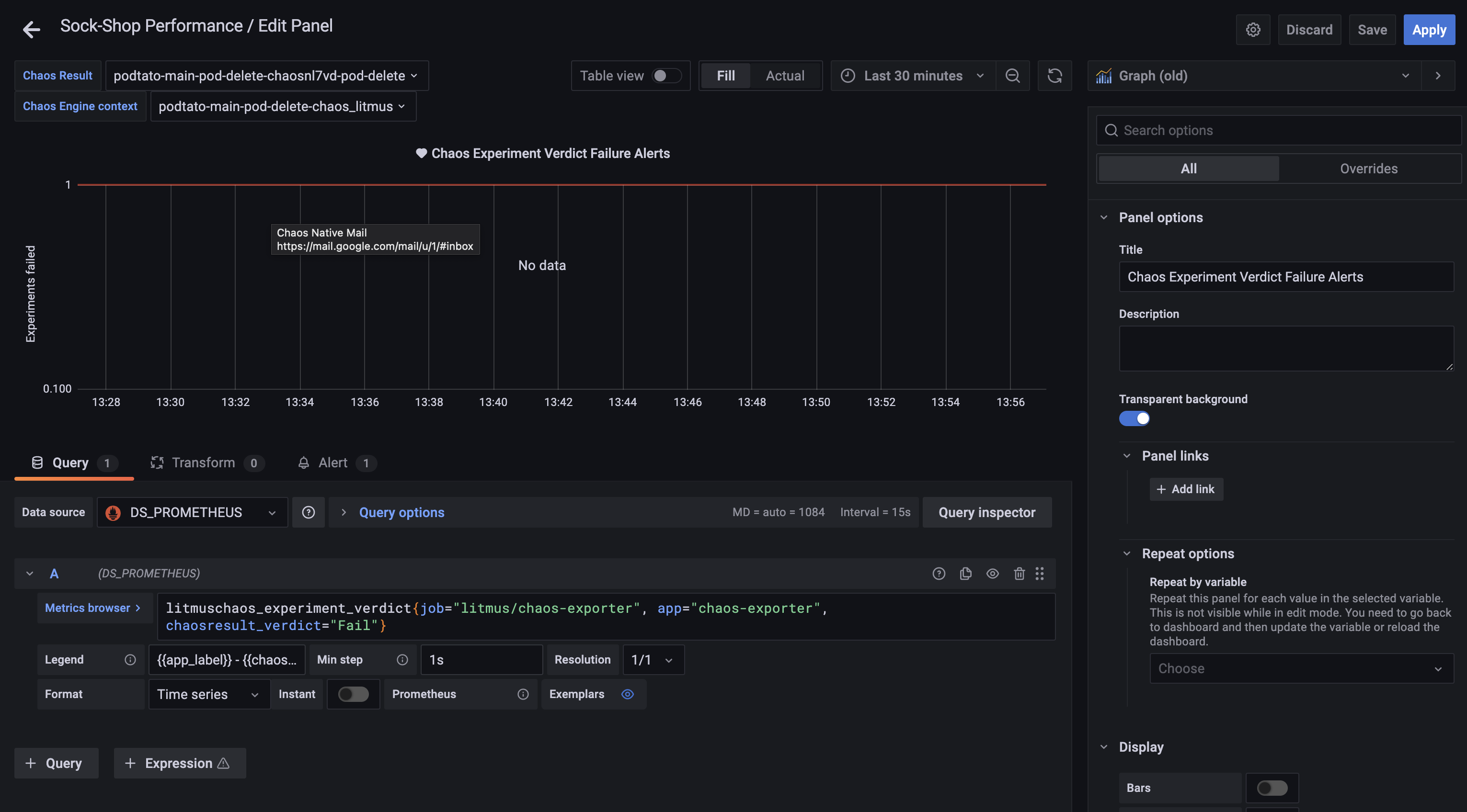 litmuschaos_experiment_verdict{job="litmus/chaos-exporter", app="chaos-exporter", chaosresult_verdict="Fail"}