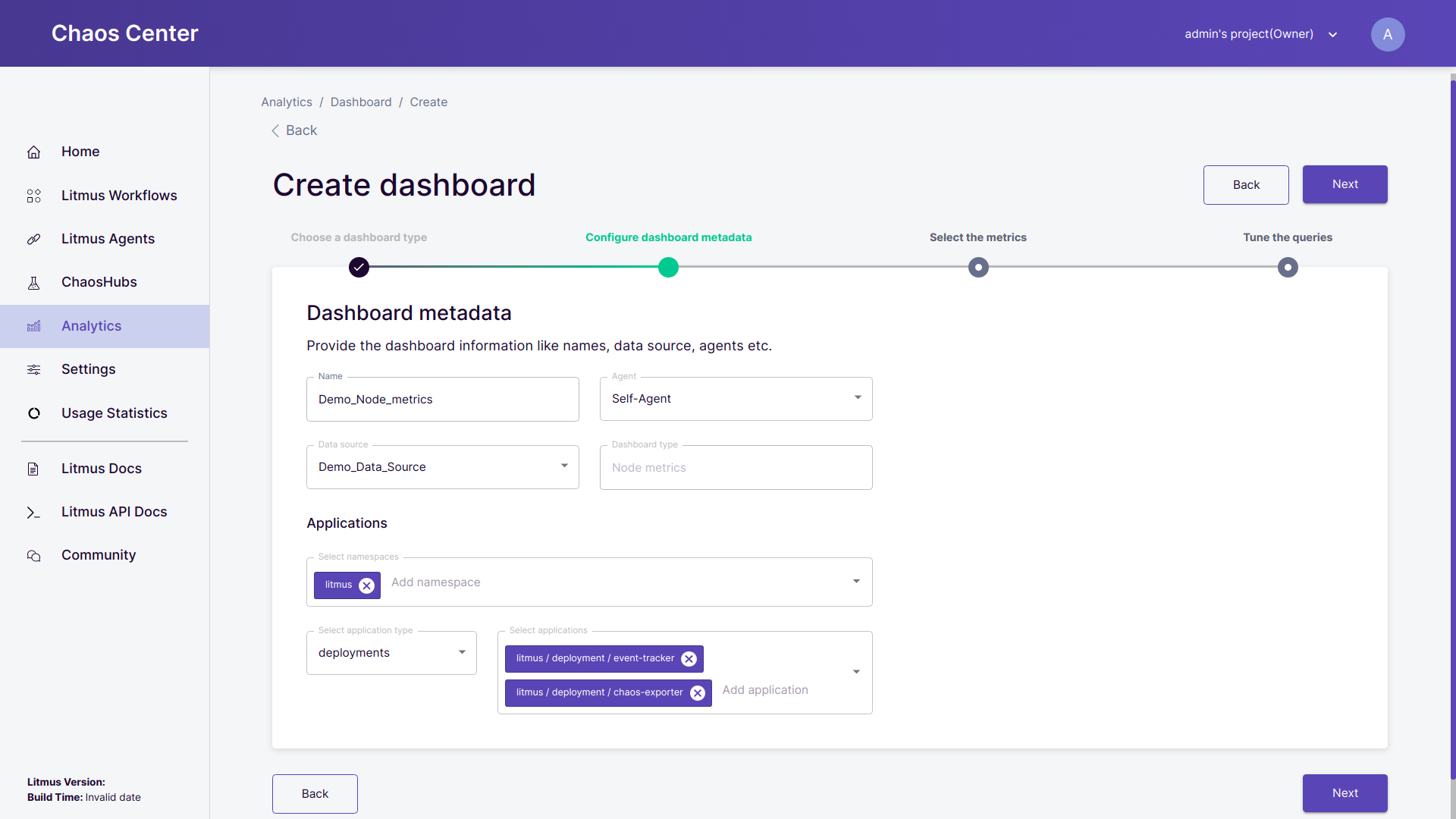 • chaos delegate: Select the chaos delegate for which you want to set up the dashboard. By default, an chaos delegate from the list of all connected chaos delegates is selected for you. You may override this as per your requirement.